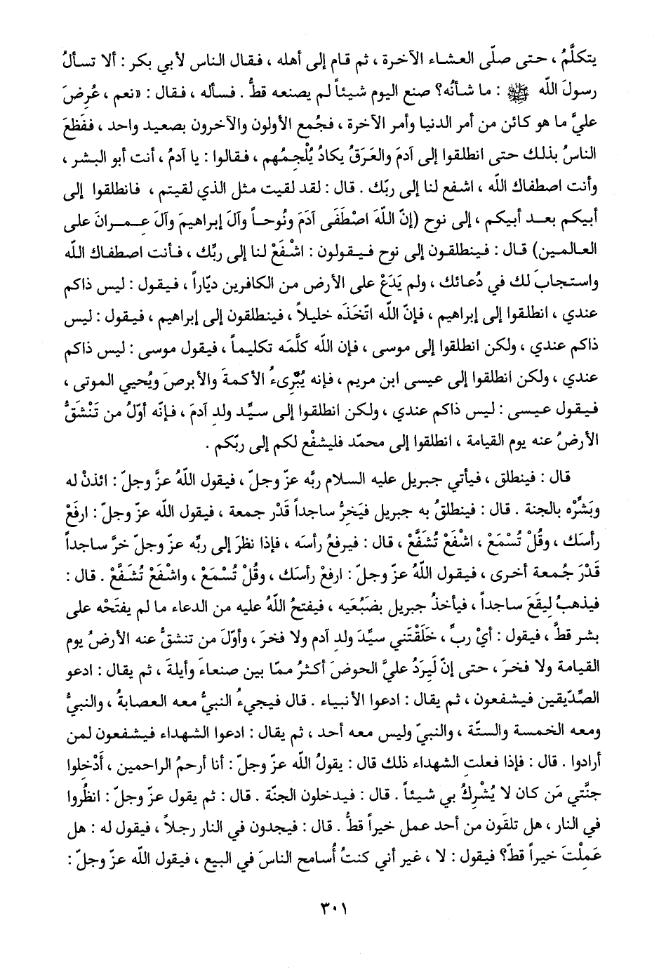 قال: فينطلق، فيأتي جبريل عليه السلام ربَّه عزّ وجلّ، فيقول اللَّهُ عزّ وجلّ: ائذنْ له وبَشِّرْه بالجنة. قال: فينطلقُ به جبريل فيَخِرُّ ساجدًا قَدْر جمعة، فيقول اللَّه عزّ وجلّ: ارفَعْ رأسَك، وقُلْ تُسْمَعْ، اشْفَعْ تُشَفَّعْ، قال: فيرفعُ رأسَه، فإذا نظرَ إلى ربِّه عزّ وجلّ خرَّ ساجدًا قَدْرَ جُمعة أخرى، فيقول اللَّهُ عزّ وجلّ: ارفعْ رأسَك، وقُلْ تُسْمَعْ، واشْفَعْ تُشَفَّعْ. قال: فيذهبُ لِيقَعَ ساجدًا، فيأخذُ جبريل بضَبُعَيه، فيفتحُ اللَّه عليه من الدعاء ما لم يفتَحْه على بشر قطَّ، فيقول: أيْ ربِّ خَلَقْتَني سيِّدَ ولدِ آدم ولا فخرَ، وأَوَّلَ من تنشقُّ عنه الأرضُ يوم القيامة ولا فخرَ، حتى إنّ لَيِرَدُ عليَّ الحوضَ أكثرُ ممّا بين صنعاءَ وأيلةَ، ثم يقال: ادعو الصِّدّيقين فيشفعون، ثم يقال: ادعوا الأنبياء. قال فيجيءُ النَّبِيُّ معه العصابةُ، والنبيُّ ومعه الخمسة والستَّة، والنبيّ وليس معه أحد، ثم يقال: ادعوا الشهداء فيشفعون لمن أرادوا. قال: فإذا فعلتِ الشهداء ذلك قال: يقولُ اللَّه عزّ وجلّ: أنا أرحمُ الراحمين، أَدْخِلوا جنَّتي مَن كان لا يُشْرِكُ بي شيئًا. قال: فيدخلون الجنّة. قال: ثم يقول عزّ وجلّ: انظُروا في النّار، هل تلقَون من أحد عمل خيرًا قطُّ. قال: فيجدون في النّار رجلًا، فيقول له: هل عَمِلْتَ خيرًا قطّ؟ فيقول: لا، غير أني كنتُ أُسامح النّاسَ في البيع، فيقول اللَّه عزّ وجلّ: