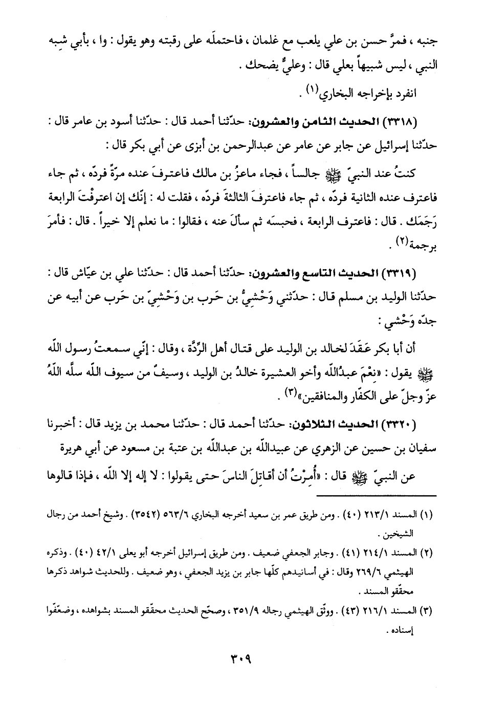 (٣) المسند ١/ ٢١٦ (٤٣). ووثّق الهيثمي رجاله ٩/ ٣٥١، وصحّح الحديث محقّقو المسند بشواهده، وضعّفوا إسناده.