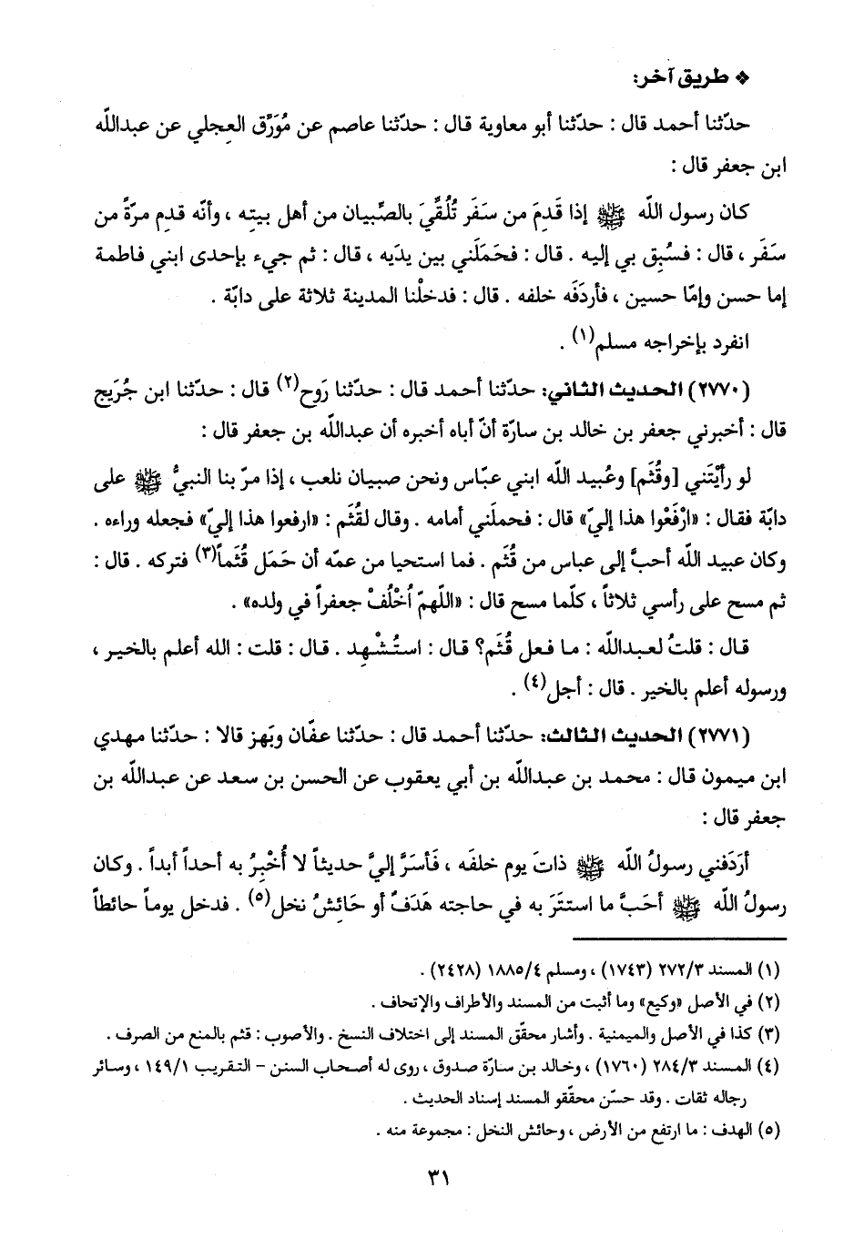 حدّثنا أحمد قال: حدّثنا أبو معاوية قال: حدّثنا عاصم عن مُوَرِّق العِجلي عن عبد اللَّه ابن جعفر قال: