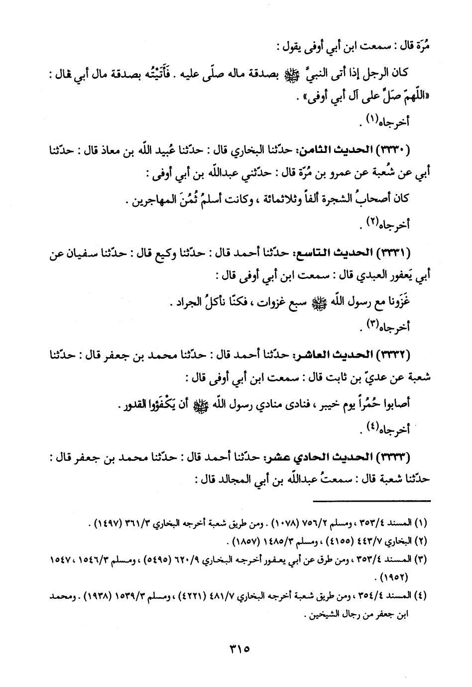 (٣٣٣٠) الحديث الثامن: حدّثنا البخاري قال: حدّثنا عُبيد اللَّه بن معاذ قال: حدّثنا أبي عن شُعبة عن عمرو بن مُرّة قال: حدّثني عبد اللَّه بن أبي أوفى: