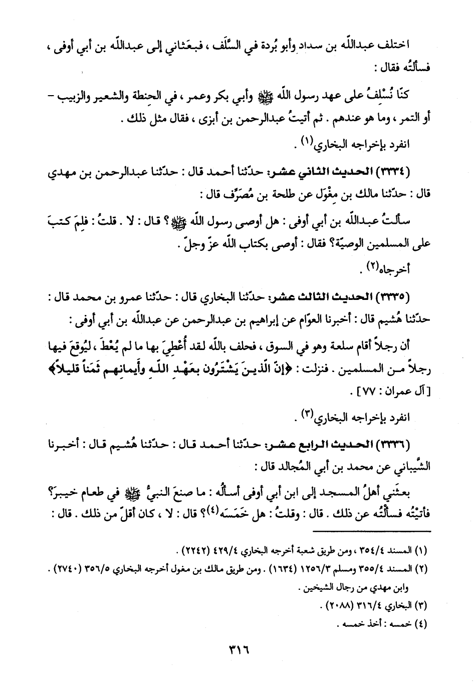 (٣٣٣٥) الحديث الثالث عشر: حدّثنا البخاري قال: حدّثنا عمرو بن محمد قال: حدّثنا هُشيم قال: أخبرنا العوّام عن إبراهيم بن عبد الرحمن عن عبد اللَّه بن أبي أوفى:
