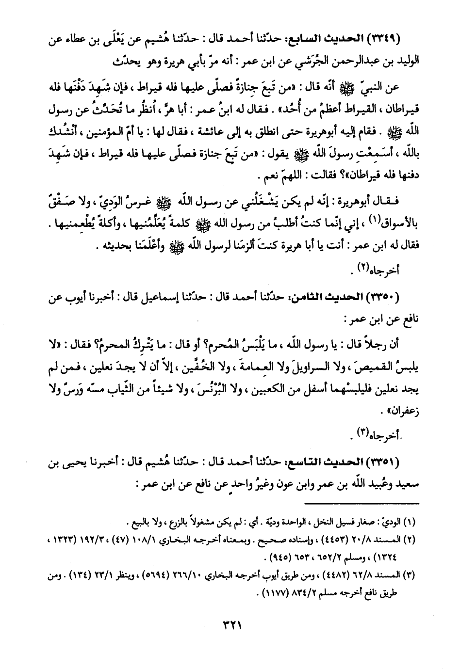 (٣٣٥١) الحديث التاسع: حدّثنا أحمد قال: حدّثنا هُشيم قال: أخبرنا يحيى بن سعيد وعُبيد اللَّه بن عمر وابن عون وغيرُ واحدٍ عن نافع عن ابن عمر: