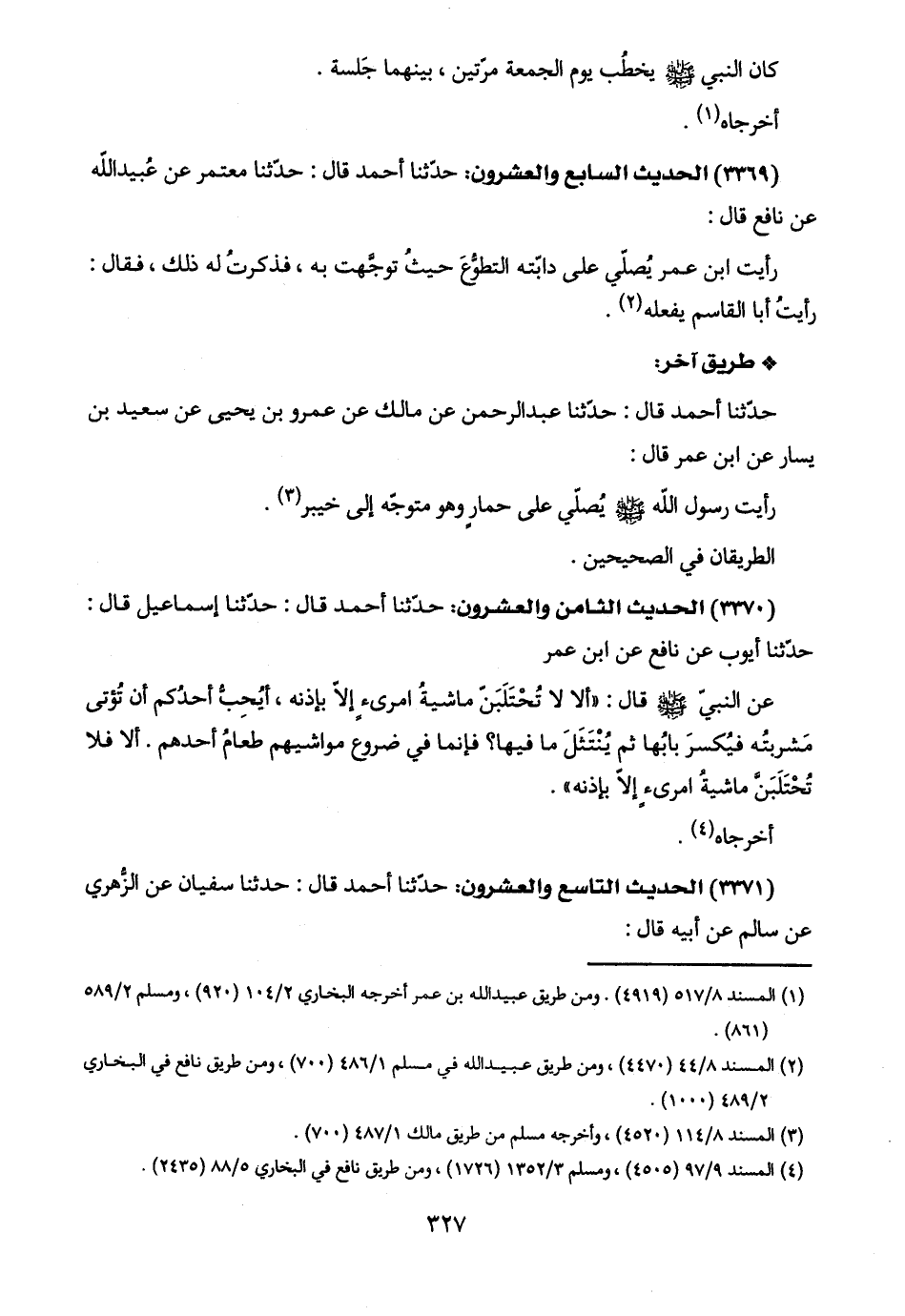 (٤) المسند ٩/ ٩٧ (٤٥٠٥)، ومسلم ٣/ ١٣٥٢ (١٧٢٦)، ومن طريق نافع في البخاري ٥/ ٨٨ (٢٤٣٥).