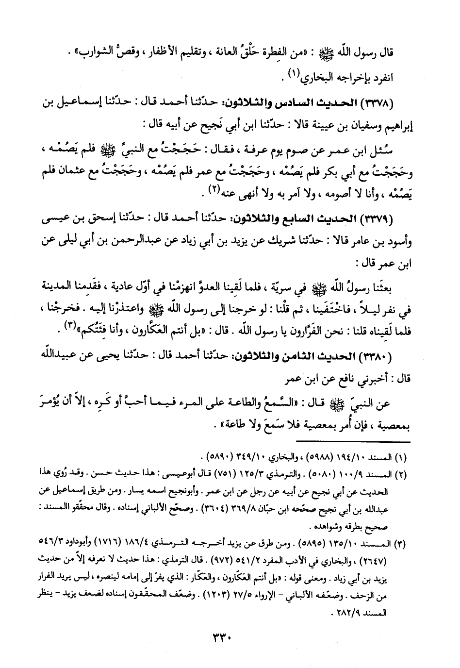 (٣٣٧٩) الحديث السابع والثلاثون: حدّثنا أحمد قال: حدّثنا إسحق بن عيسى وأسود بن عامر قالا: حدّثنا شريك عن يزيد بن أبي زياد عن عبد الرحمن بن أبي ليلى عن ابن عمر قال: