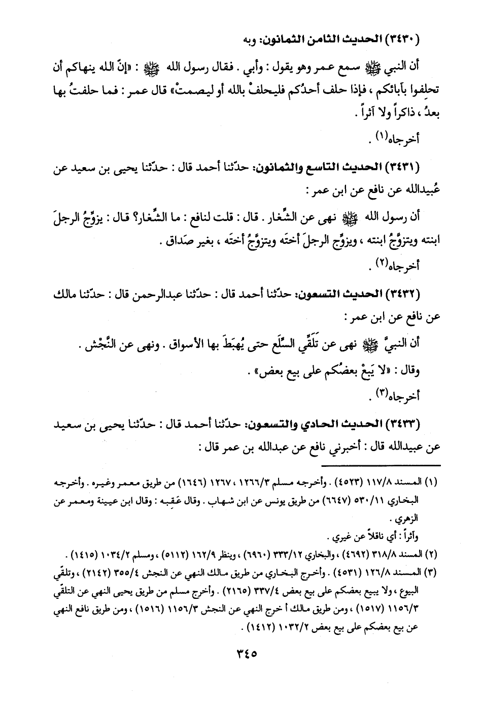 (٣٤٣٣) الحديث الحادي والتسعون: حدّثنا أحمد قال: حدّثنا يحيى بن سعيد عن عبيد اللَّه قال: أخبرني نافع عن عبد اللَّه بن عمر قال: