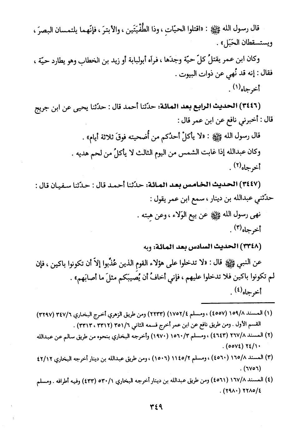 (٣) المسند ٨/ ١٦٥ (٤٥٦٠)، ومسلم ٢/ ١١٤٥ (١٥٠٦)، ومن طريق عبد اللَّه بن دينار أخرجه البخاري ١٢/ ٤٢ (٦٧٥٦).