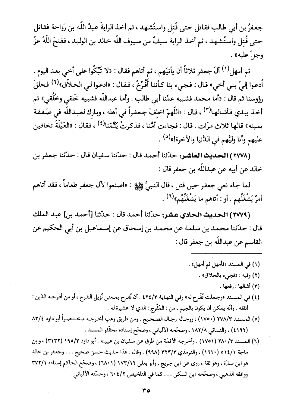 ثم أمهل (١) آلَ جعفر ثلاثًا أن يأتيَهم، ثم أتاهم فقال: "لا تَبْكُوا على أخي بعد اليوم. اُدعوا إليّ بني أخي" قال: فجيء بنا كأننا أَفْرُخٌ، فقال: "ادعوا لي الحلّاق" (٢) فحلقَ رؤوسنا ثم قال: "أما محمد فشبيه عمِّنا أبي طالب. وأما عبد اللَّه فشبيه خَلقي وخُلُقي" ثم أخذ بيدي فأشالها (٣)، قال: "اللهمّ اخلِفْ جعفرًا في أهله، وبارك لعبد اللَّه في صَفقة يمينه" قالها ثلاث مرّات. قال: فجاءت أمُّنا، فذكرتْ يُتْمَنا (٤)، فقال: "العَيْلَةَ تخافين عليهم وأنا وليُّهم في الدُّنيا والآخرة! " (٥).