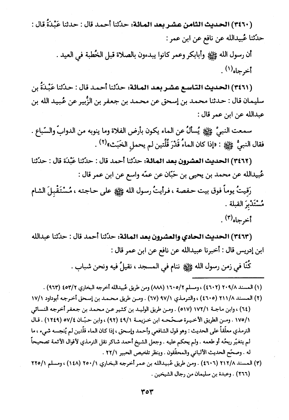 (٣٤٦٣) الحديث الحادي والعشرون بعد المائة: حدّثنا أحمد قال: حدّثنا عبد اللَّه ابن إدريس قال: أخبرنا عبيد اللَّه عن نافع عن ابن عمر قال: