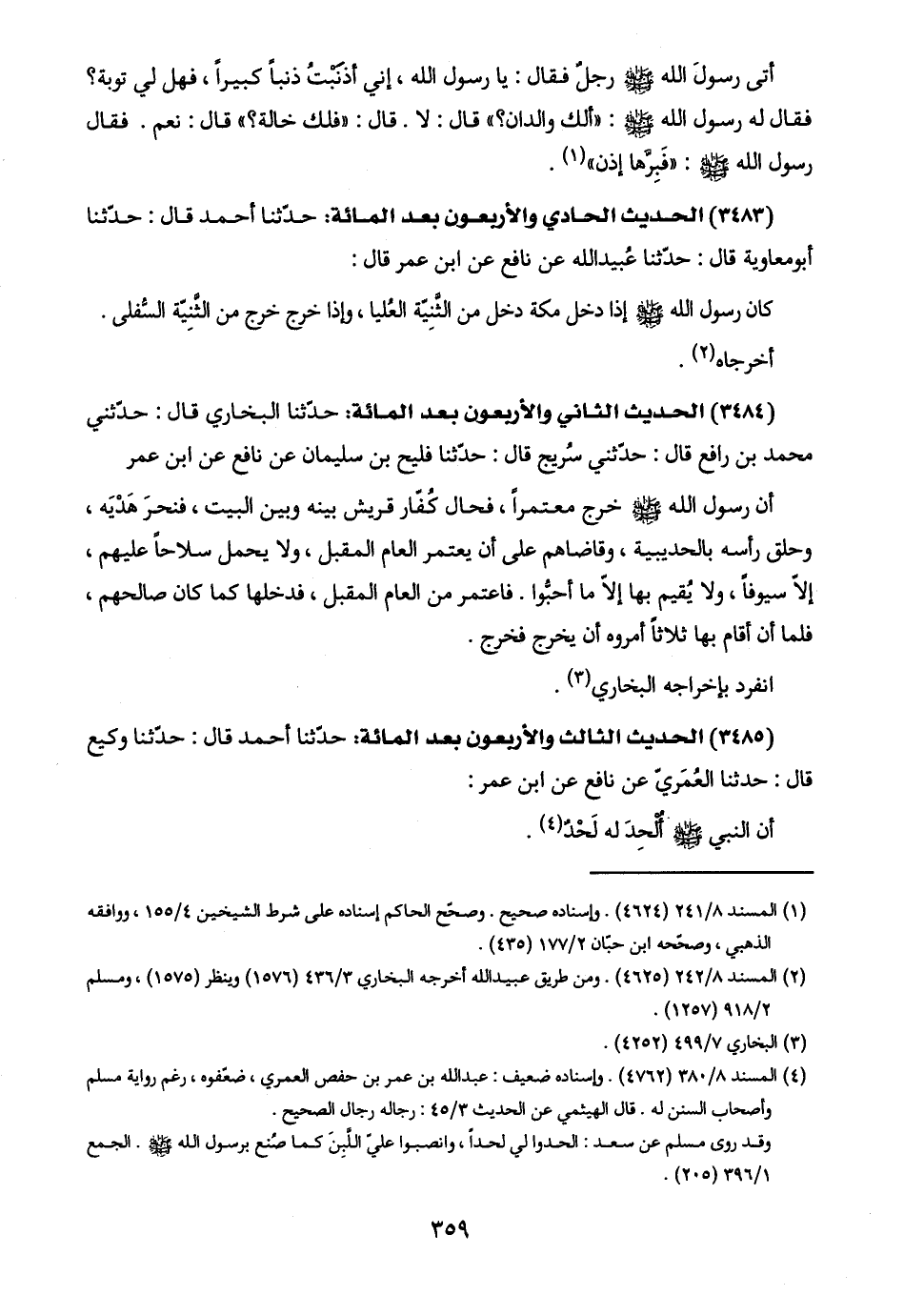 (٤) المسند ٨/ ٣٨٠ (٤٧٦٢). وإسناده ضعيف: عبد اللَّه بن عمر بن حفص العمري، ضعّفوه، رغم رواية مسلم وأصحاب السنن له. قال الهيثمي عن الحديث ٣/ ٤٥: رجاله رجال الصحيح.