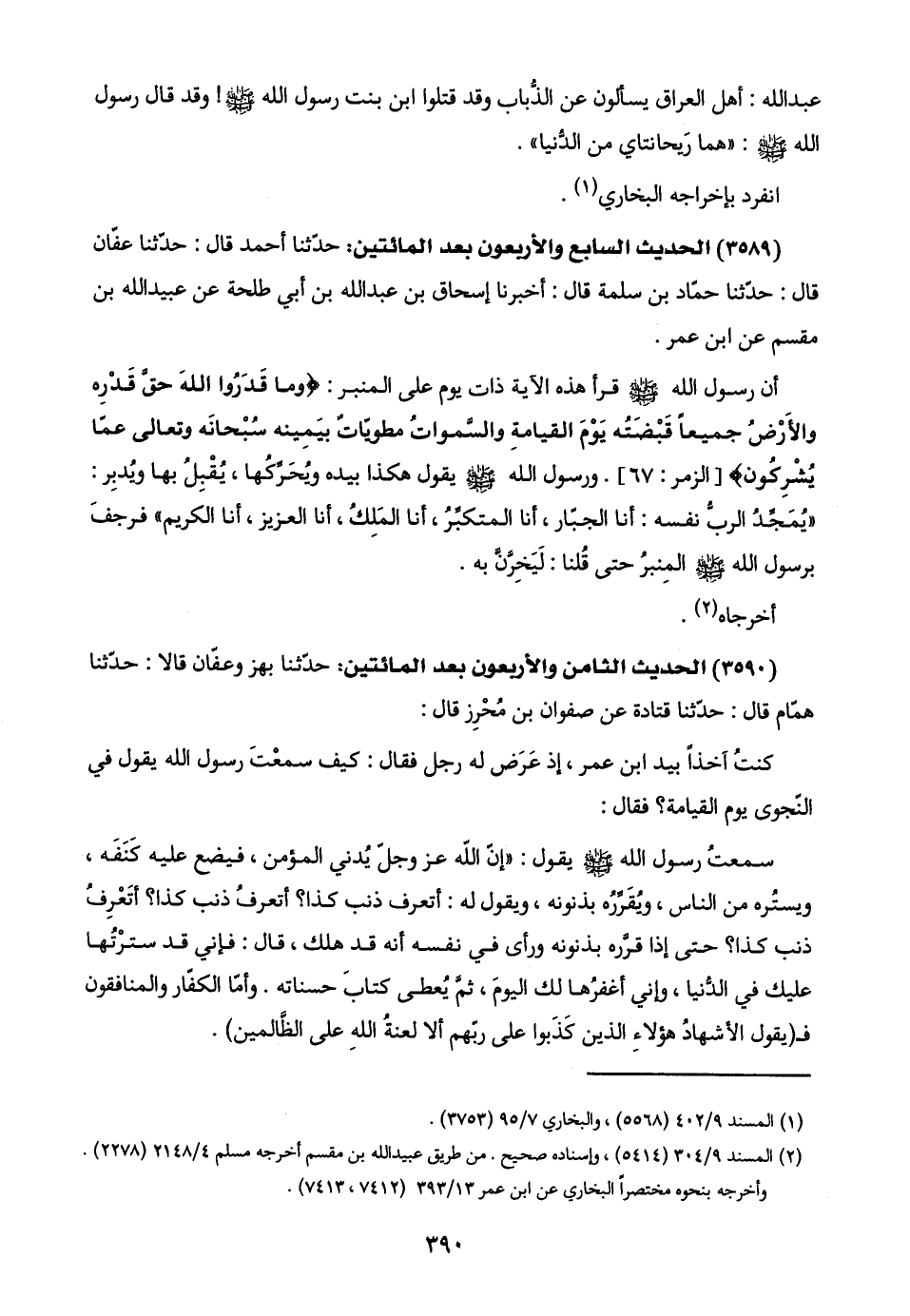 (٣٥٩٠) الحديث الثامن والأربعون بعد المائتين: حدّثنا بهز وعفّان قالا: حدّثنا همّام قال: حدّثنا قتادة عن صفوان بن مُحْرِز قال: