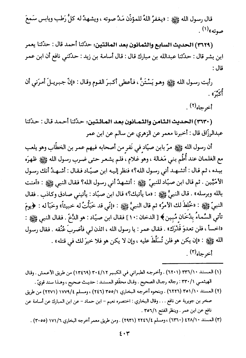 (٣٦٢٩) الحديث السابع والثمانون بعد المائتين: حدّثنا أحمد قال: حدّثنا يعمر ابن بشر قال: حدّثنا عبد اللَّه بن مبارك قال: قال أسامة بن زيد: حدّثني نافع أن ابن عمر قال: