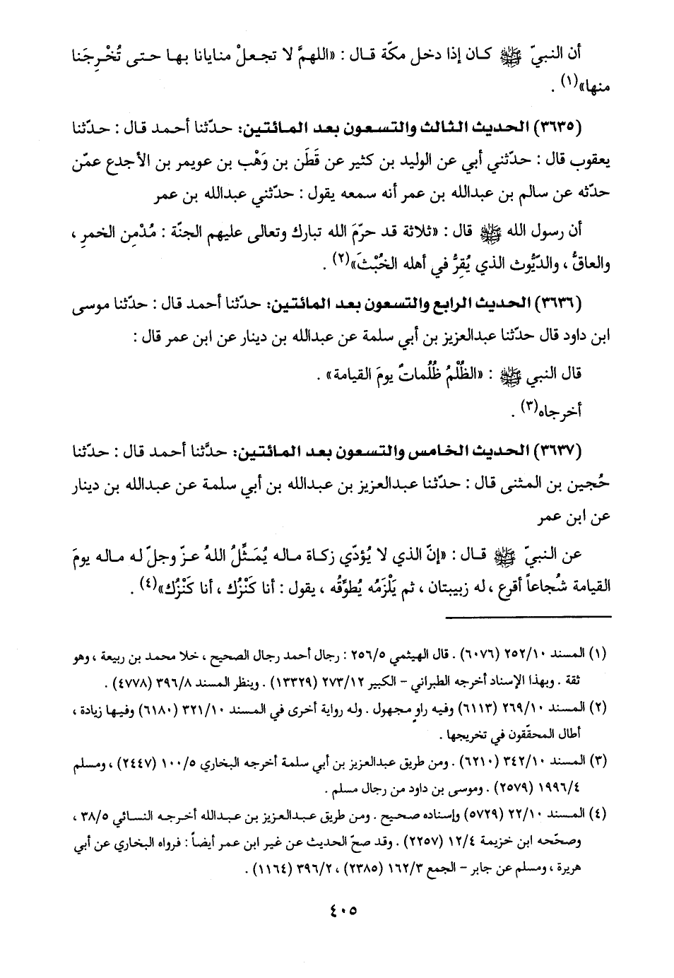 (٣٦٣٧) الحديث الخامس والتسعون بعد المائتين: حدّثنا أحمد قال: حدّثنا حُجين بن المثنى قال: حدّثنا عبد العزيز بن عبد اللَّه بن أبي سلمة عن عبد اللَّه بن دينار عن ابن عمر: