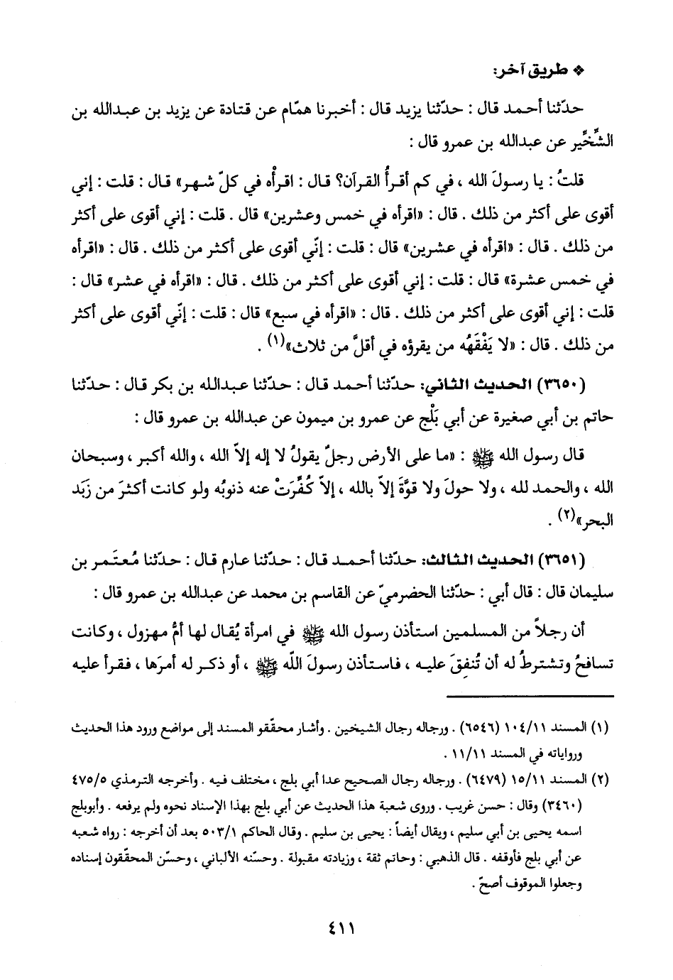 (٣٦٥٠) الحديث الثاني: حدّثنا أحمد قال: حدّثنا عبد اللَّه بن بكر قال: حدّثنا حاتم بن أبي صغيرة عن أبي بَلْج عن عمرو بن ميمون عن عبد اللَّه بن عمرو قال: