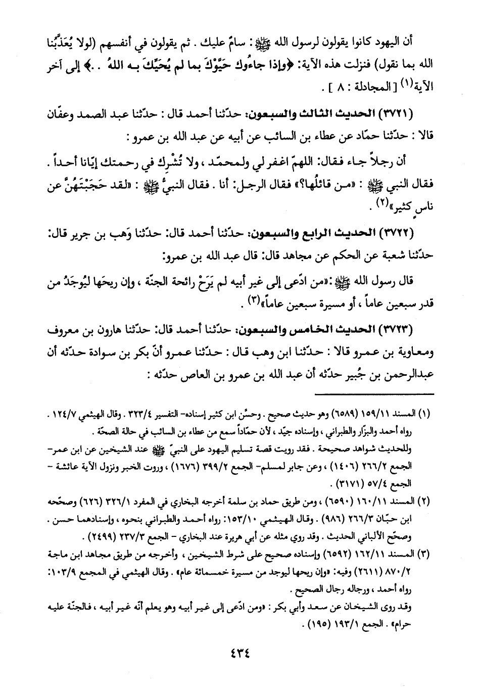 (٣٧٢١) الحديث الثالث والسبعون: حدّثنا أحمد قال: حدّثنا عبد الصمد وعفّان قالا: حدّثنا حمّاد عن عطاء بن السائب عن أبيه عن عبد اللَّه بن عمرو: