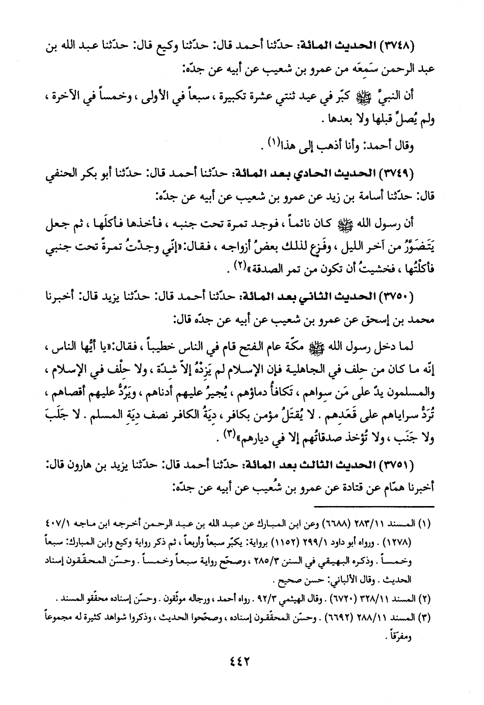 (٣٧٤٩) الحديث الحادي بعد المائة: حدّثنا أحمد قال: حدّثنا أبو بكر الحنفي قال: حدّثنا أسامة بن زيد عن عمرو بن شعيب عن أبيه عن جدّه: