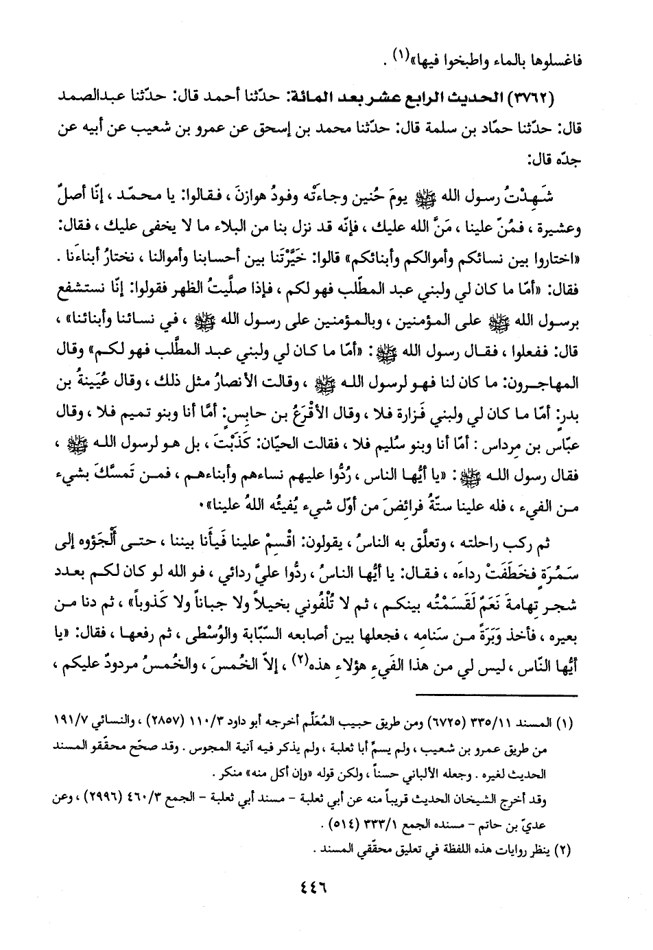 (٣٧٦٢) الحديث الرابع عشر بعد المائة: حدّثنا أحمد قال: حدّثنا عبد الصمد قال: حدّثنا حمّاد بن سلمة قال: حدّثنا محمد بن إسحق عن عمرو بن شعيب عن أبيه عن جدّه قال: