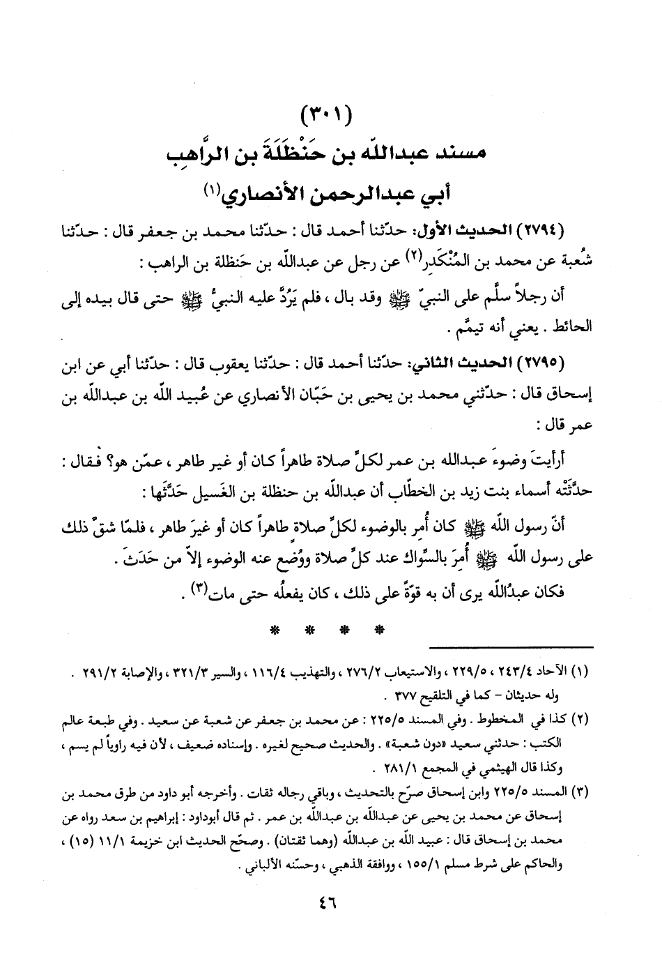 (٣٠١) مسند عبد اللَّه بن حَنْظَلَةَ بن الرَّاهِب أبي عبد الرحمن الأنصاري (١)