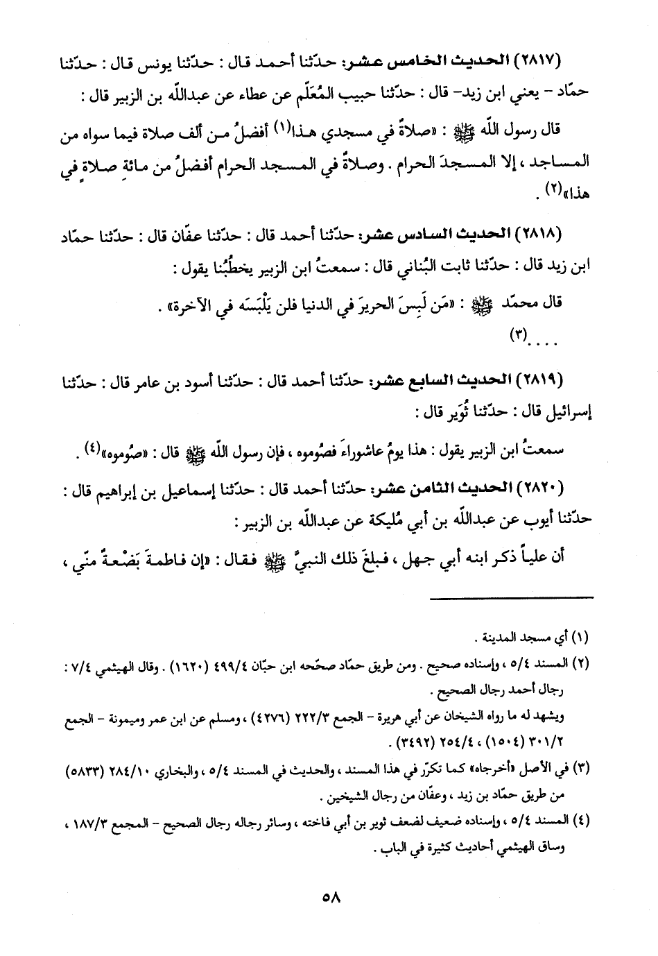 (٢٨١٨) الحديث السادس عشر: حدّثنا أحمد قال: حدّثنا عفّان قال: حدّثنا حمّاد ابن زيد قال: حدّثنا ثابت البُناني قال: سمعتُ ابن الزبير يخطُبُنا يقول: