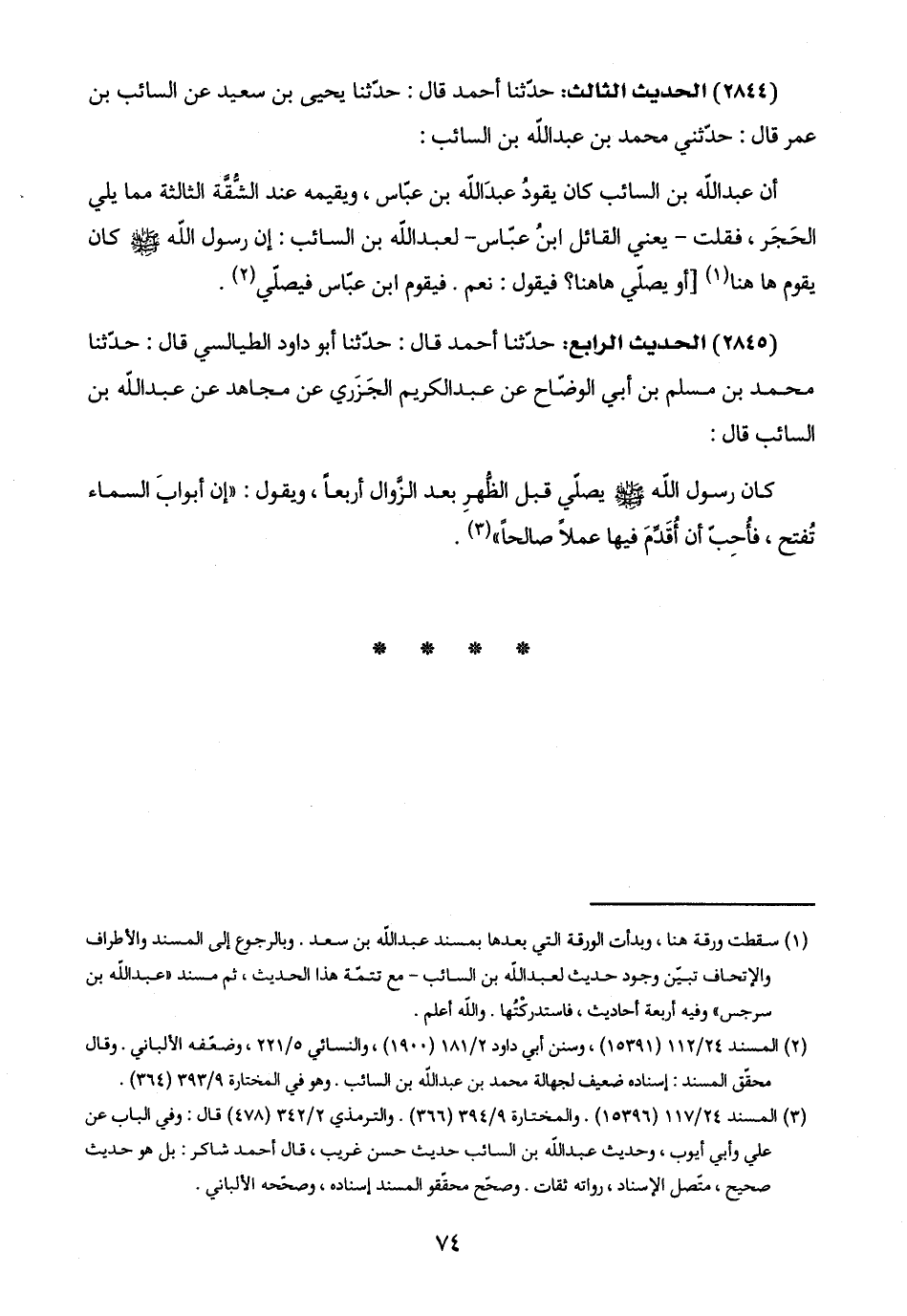(١) سقطت ورقة هنا، وبدأت الورقة التي بعدها بمسند عبد اللَّه بن سعد. وبالرجوع إلى المسند والأطراف والإتحاف تبيّن وجود حديث لعبد اللَّه بن السائب - مع تتمّة هذا الحديث، ثم مسند "عبد اللَّه بن سرجس" وفيه أربعة أحاديث، فاستدركْتُها. واللَّه أعلم.