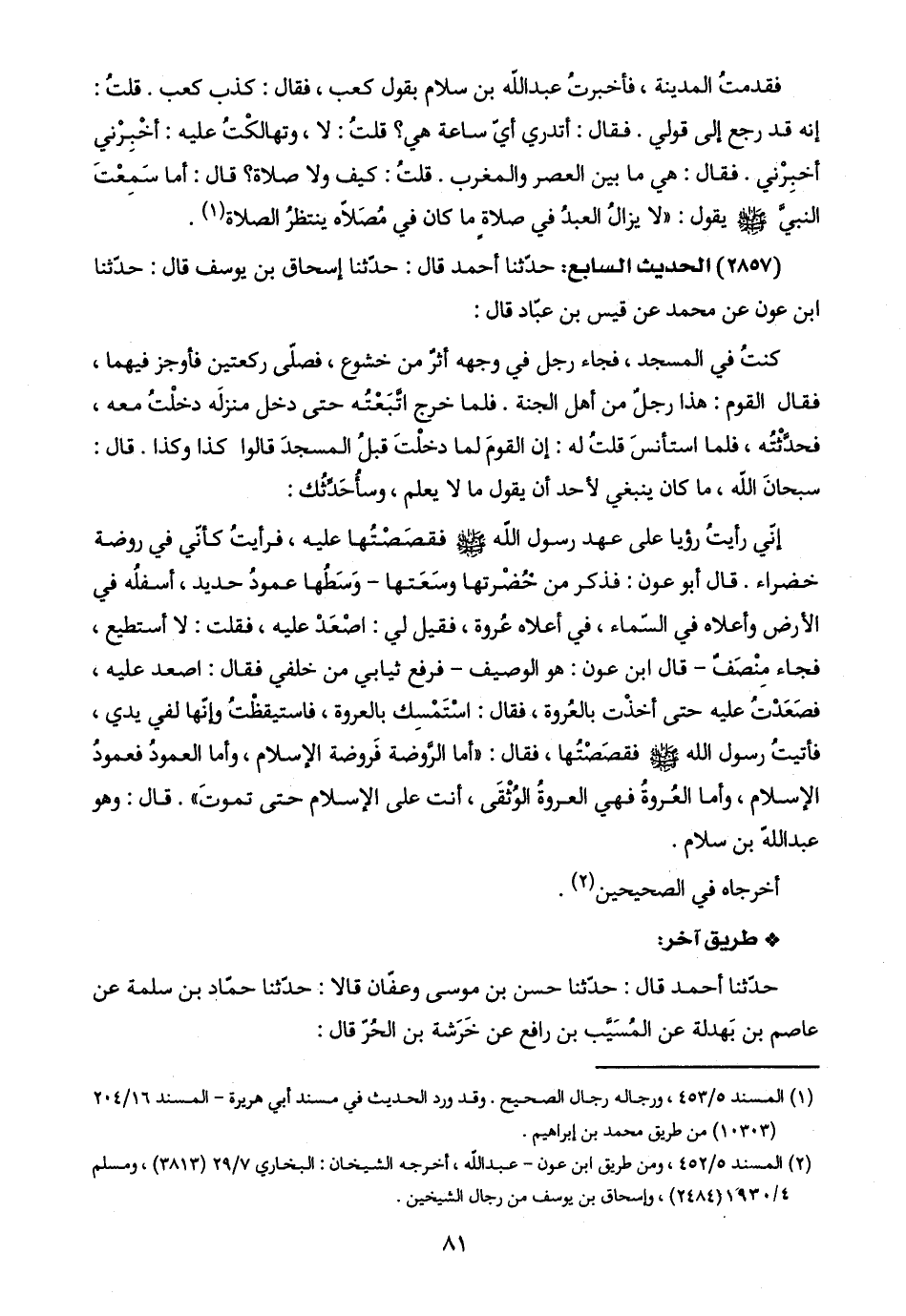 (٢) المسند ٥/ ٤٥٢، ومن طريق ابن عون - عبد اللَّه، أخرجه الشيخان: البخاري ٧/ ٢٩ (٣٨١٣)، ومسلم ٤/ ١٩٣٠ (٢٤٨٤)، وإسحاق بن يوسف من رجال الشيخين.