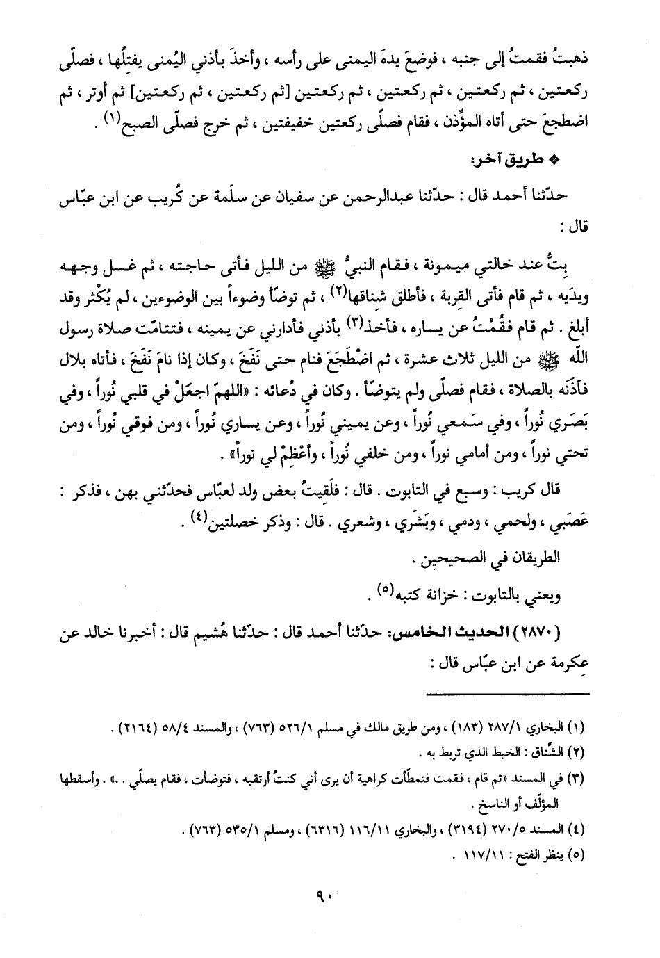 بِتُّ عند خالتي ميمونة، فقام النبيُّ -صلى اللَّه عليه وسلم- من الليل فأتى حاجته، ثم غسل وجهه ويدَيه، ثم قام فأتى القِربة، فأطلق شِناقها (٢)، ثم توضّأ وضوءًا بين الوضوءين، لم يُكْثر وقد أبلغ. ثم قام فقُمْتُ عن يساره، فأخَذ (٣) بأذني فأدارني عن يمينه، فتتامّت صلاة رسول اللَّه -صلى اللَّه عليه وسلم- من الليل ثلاث عشرة، ثم اضْطَجَعَ فنام حتى نَفَخَ، وكان إذا نامَ نَفَخَ، فأتاه بلال فآذَنَه بالصلاة، فقام فصلّى ولم يتوضّأ. وكان في دُعائه: "اللهمّ اجعَلْ في قلبي نُورًا، وفي بَصَري نُورًا، وفي سَمعي نُورًا، وعن يميني نُورًا، وعن يساري نُورًا، ومن فوقي نُورًا، ومن تحتي نورًا، ومن أمامي نورًا، ومن خلفي نُورًا، وأعْظِمْ لي نورًا".