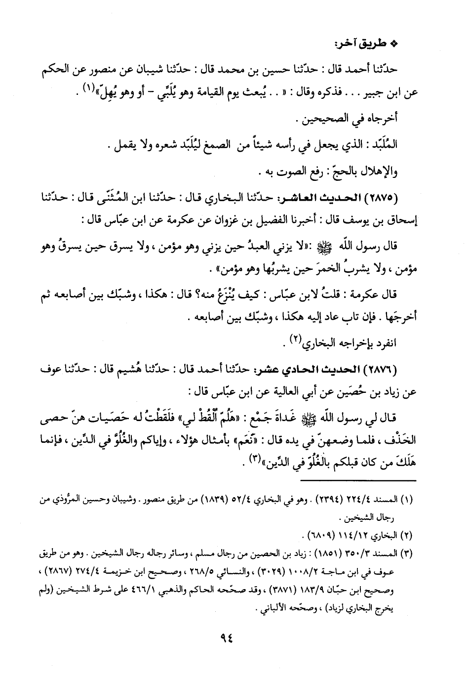 (١) المسند ٤/ ٢٢٤ (٢٣٩٤). وهو في البخاري ٤/ ٥٢ (١٨٣٩) من طريق منصور. وشيبان وحسين المرُّوذي من رجال الشيخين.