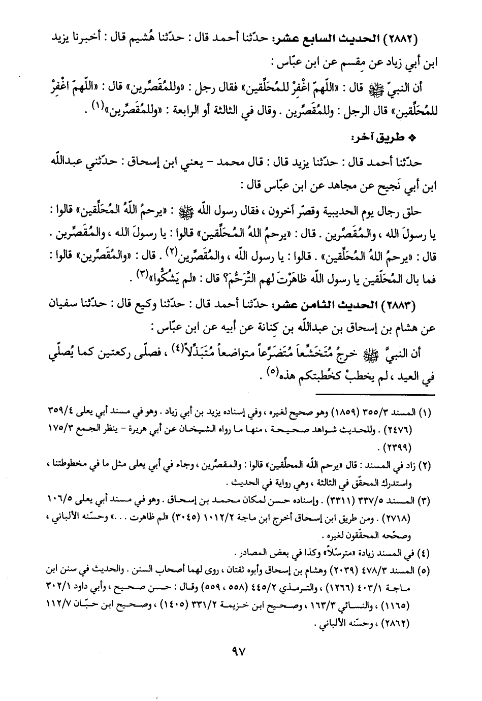 حلق رجال يوم الحديبية وقصّر آخرون، فقال رسول اللَّه -صلى اللَّه عليه وسلم-: "يرحمُ اللَّه المُحَلِّقين" قالوا: يا رسولَ اللَّه، والمُقَصِّرين. قال: "يرحمُ اللَّه المُحَلِّقين" قالوا: يا رسولَ اللَّه، والمُقَصِّرين. قال: "يرحمُ اللَّه المُحَلِّقين". قالوا: يا رسول اللَّه، والمُقَصِّرين (٢). قال: "والمُقَصِّرين" قالوا: فما بال المُحَلِّقين يا رسول اللَّه ظاهَرْتَ لهم التَّرَحُّمَ؟ قال: "لم يَشُكُّوا" (٣).
