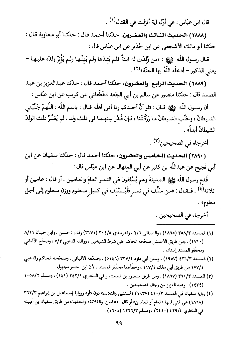(٤) رواية سفيان في المسند ٣/ ٤١٠ (١٩٣٧) "السنتين والثلاث" دون "أو" ورواية إسماعيل بن إبراهيم ٣/ ٣٦٢ (١٨٦٨) هي التي فيها "العام أو العامين" أو قال: "عامين والثلاثة" والحديث من طريق سفيان بن عيينة في البخاري ٤/ ٤٢٩ (٢٤٤٠)، ومسلم ٣/ ١٢٢٦ (١٦٠٤).