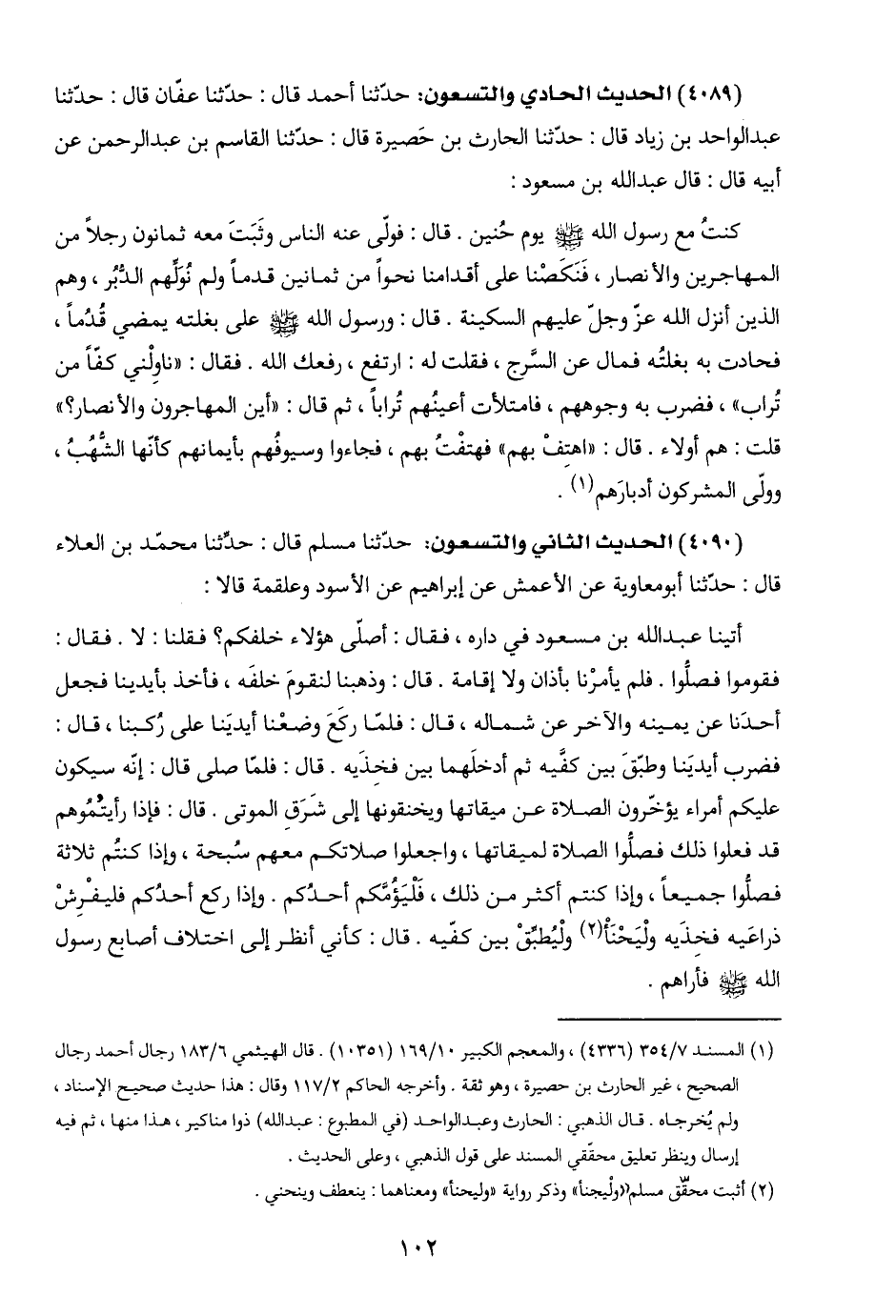 (٤٠٨٩) الحديث الحادي والتسعون: حدّثنا أحمد قال: حدّثنا عفّان قال: حدّثنا عبد الواحد بن زياد قال: حدّثنا الحارث بن حَصيرة قال: حدّثنا القاسم بن عبد الرحمن عن أبيه قال: قال عبد اللَّه بن مسعود: