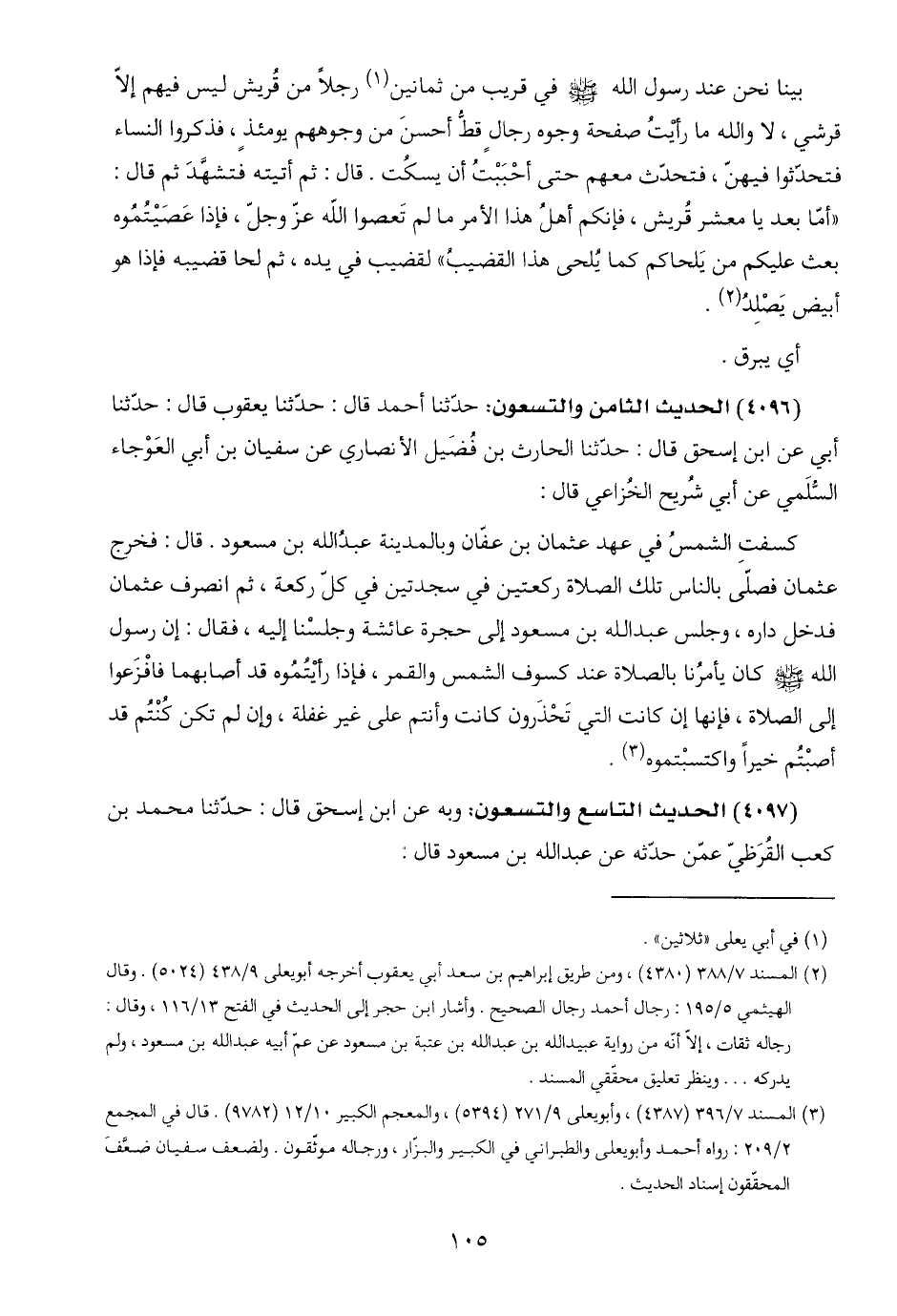 (٣) المسند ٧/ ٣٩٦ (٤٣٨٧)، وأبو يعلى ٩/ ٢٧١ (٥٣٩٤)، والمعجم الكبير ١٠/ ١٢ (٩٧٨٢). قال في المجمع ٢/ ٢٠٩: رواه أحمد وأبو يعلى والطبراني في الكبير والبزّار، ورجاله موثّقون. ولضعف سفيان ضعَّفَ المحقّقون إسناد الحديث.