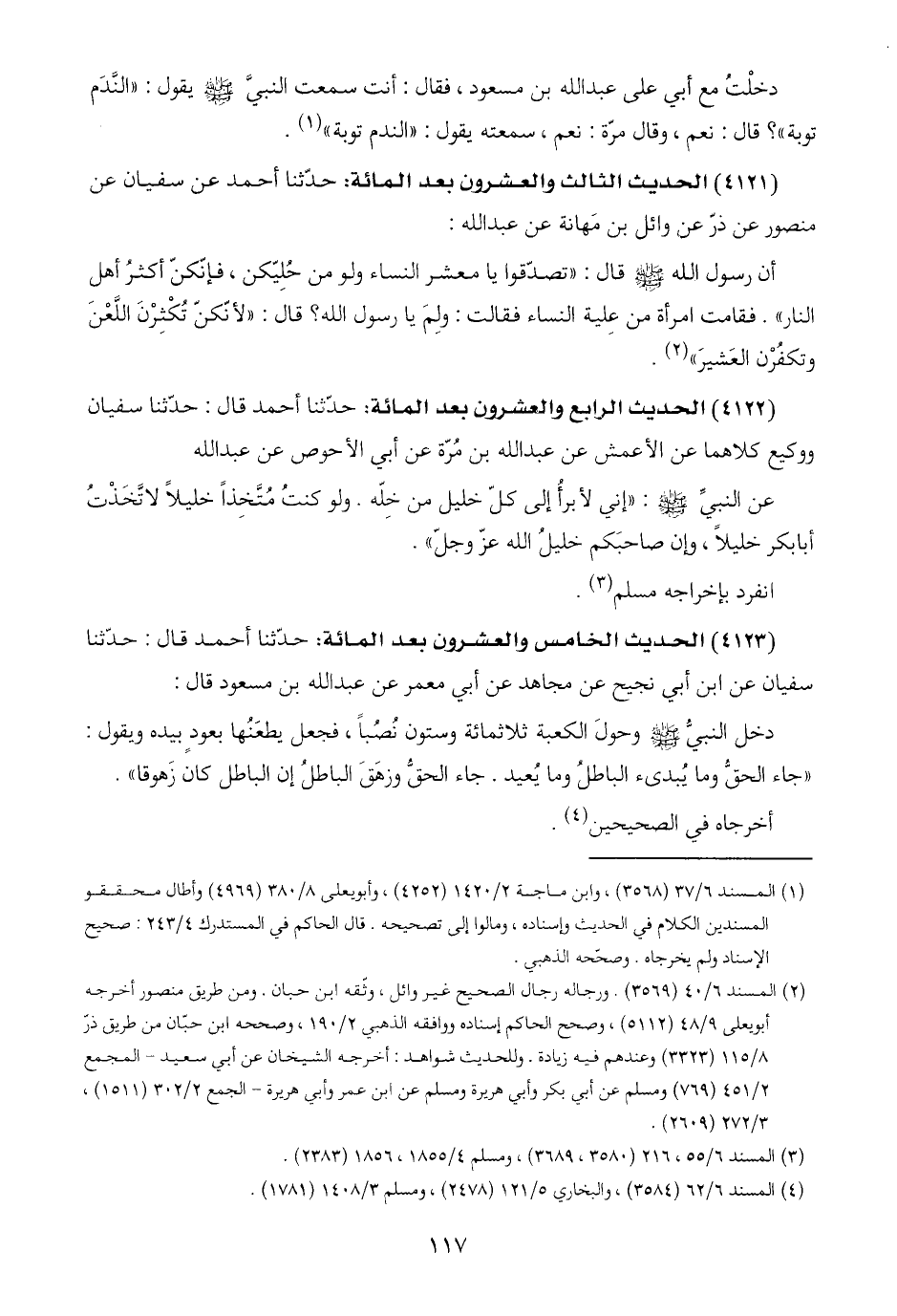 (٤١٢٢) الحديث الرابع والعشرون بعد المائة: حدّثنا أحمد قال: حدّثنا سفيان ووكيع كلاهما عن الأعمش عن عبد اللَّه بن مُرّة عن أبي الأحلإص عن عبد اللَّه: