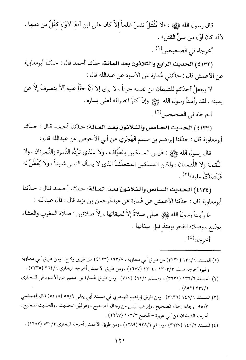(٤١٣٤) الحديث السادس والثلاثون بعد المائة: حدّثنا أحمد قال: حدّثنا أبو معاوية قال: حدّثنا الأعمش عن عُمارة عن عبد الرحمن بن يزيد قال: قال عبد اللَّه:
