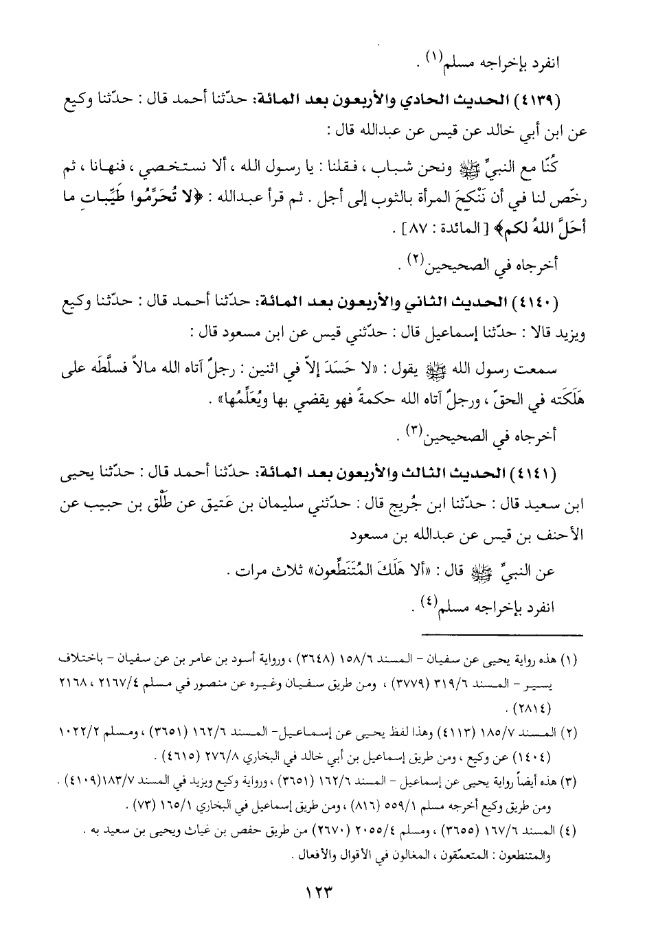 (٤١٣٩) الحديث الحادي والأربعون بعد المائة: حدّثنا أحمد قال: حدّثنا وكيع عن ابن أبي خالد عن قيس عن عبد اللَّه قال: