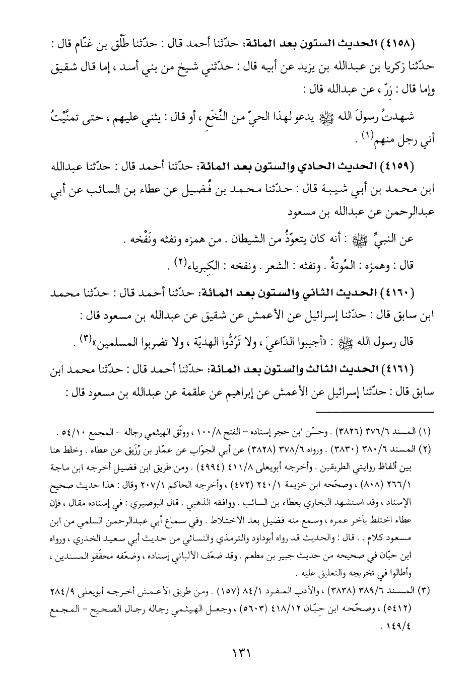 (٤١٥٩) الحديث الحادي والستون بعد المائة: حدّثنا أحمد قال: حدّثنا عبد اللَّه ابن محمد بن أبي شيبة قال: حدّثنا محمد بن فُضيل عن عطاء بن السائب عن أبي عبد الرحمن عن عبد اللَّه بن مسعود: