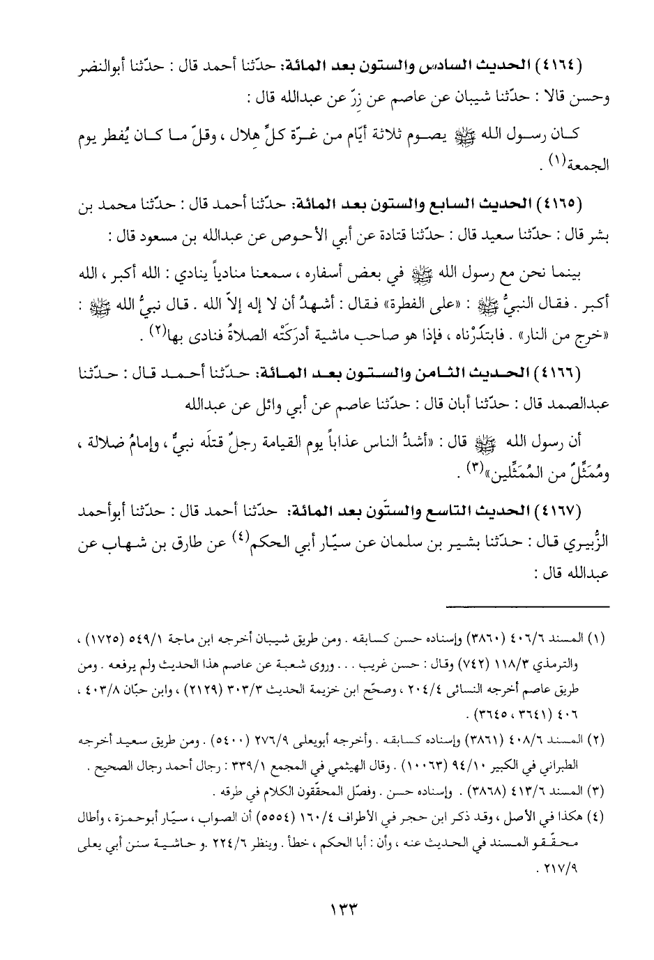 (٣) المسند ٦/ ٤١٣ (٣٨٦٨). وإسناده حسن. وفصّل المحقّقون الكلام في طرقه.