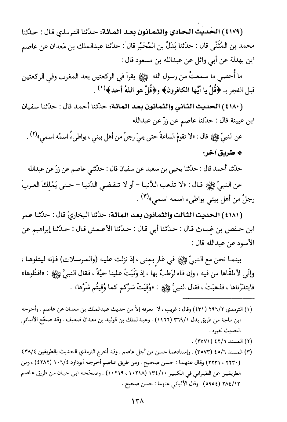 (٤١٧٩) الحديث الحادي والثمانون بعد المائة: حدّثنا الترمذي قال: حدّثنا محمد بن المُثَنَّى قال: حدّثنا بَدَلُ بن المُحَبَّر قال: حدّثنا عبد الملك بن مَعدان عن عاصم ابن بهدلة عن أبي وائل عن عبد اللَّه بن مسعود قال: