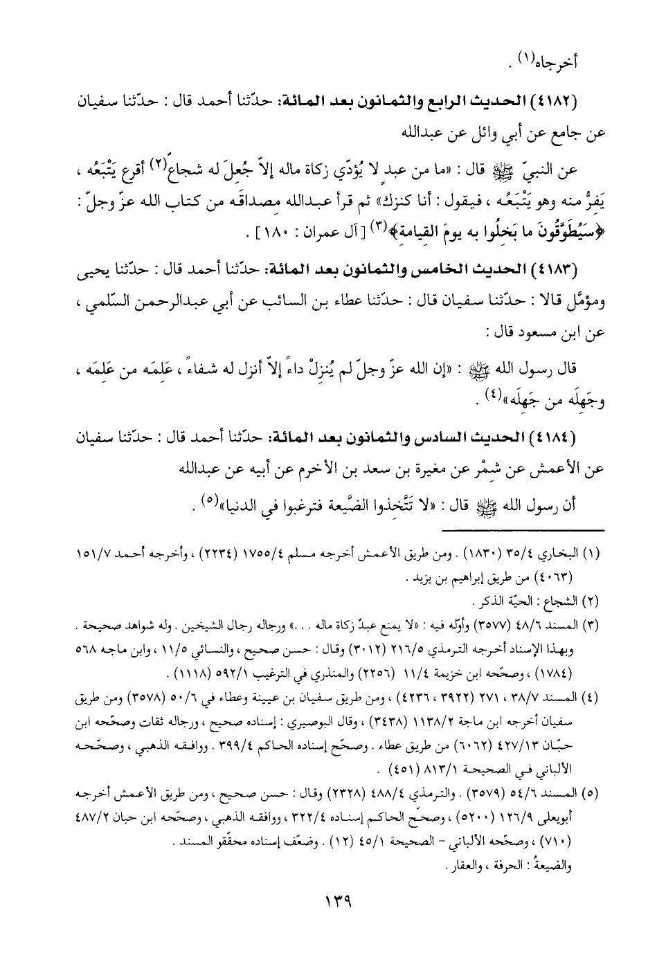 (٤١٨٣) الحديث الخامس والثمانون بعد المائة: حدّثنا أحمد قال: حدّثنا يحيى ومؤمَّل قالا: حدّثنا سفيان قال: حدّثنا عطاء بن السائب عن أبي عبد الرحمن السّلمي، عن ابن مسعود قال: