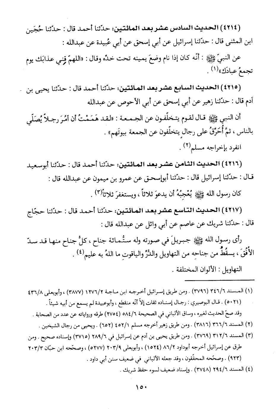 (٤٢١٤) الحديث السادس عشر بعد المائتين: حدّثنا أحمد قال: حدّثنا حُجَين ابن المثنى قال: حدّثنا إسرائيل عن أبي إسحق عن أبي عُبيدة عن عبد اللَّه: