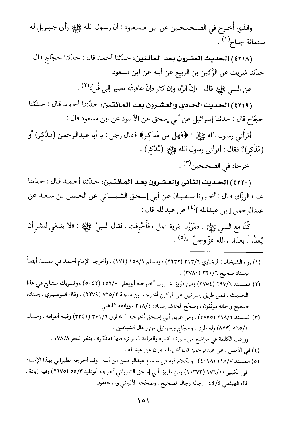 (٤٢١٩) الحديث الحادي والعشرون بعد المائتين: حدّثنا أحمد قال: حدّثنا حجّاج قال: حدّثنا إسرائيل عن أبي إسحق عن الأسود عن ابن مسعود قال: