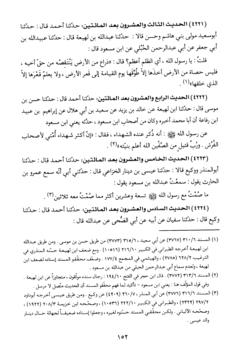(٤٢٢١) الحديث الثالث والعشرون بعد المائتين: حدّثنا أحمد قال: حدّثنا أبو سعيد مولى بني هاشم وحسن قالا: حدّثنا عبد اللَّه بن لهيعة قال: حدّثنا عبيد اللَّه بن أبي جعفر عن أبي عبد الرحمن الحُبُلي عن ابن مسعود قال: