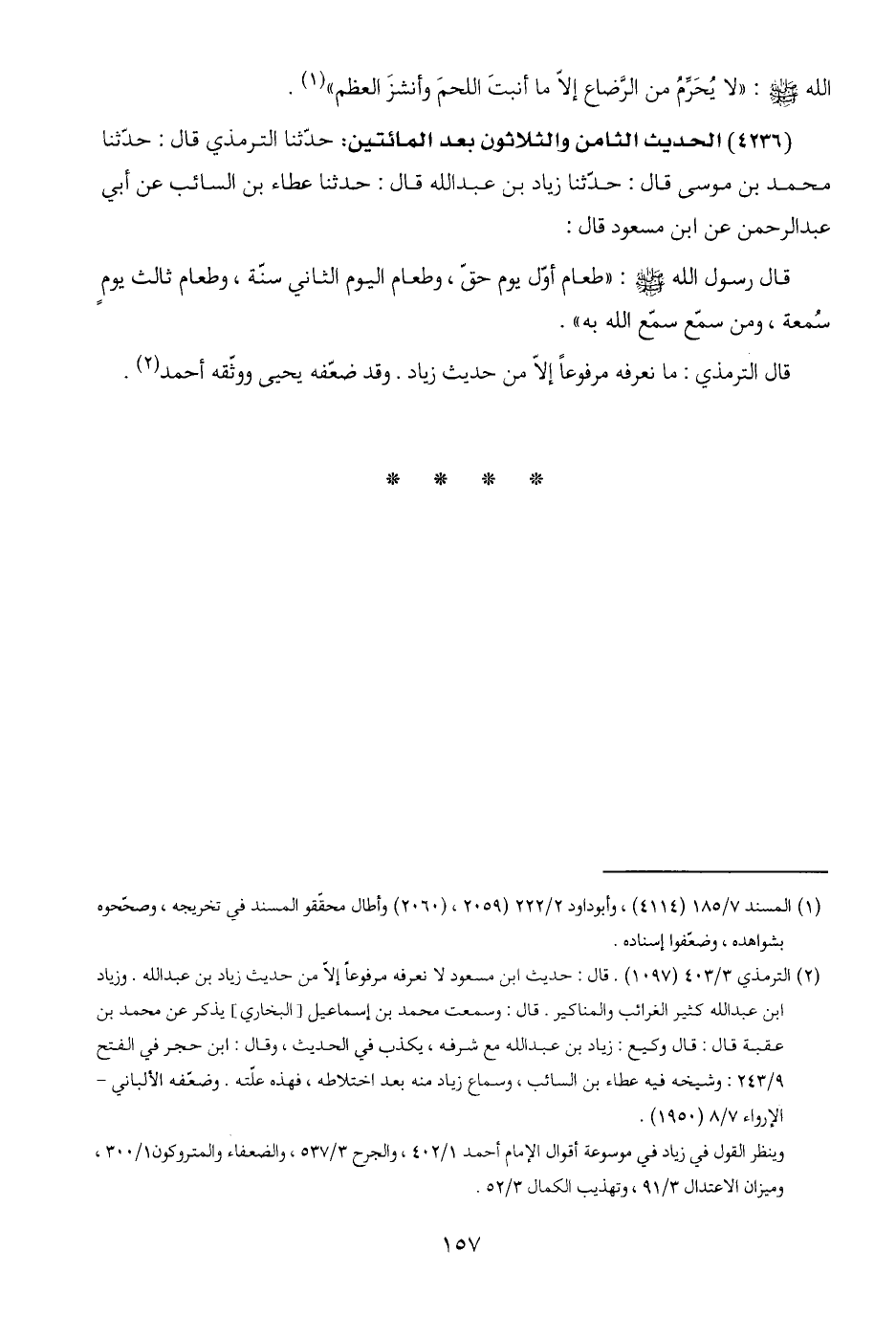 (١) المسند ٧/ ١٨٥ (٤١١٤)، وأبو داود ٢/ ٢٢٢ (٢٠٥٩، ٢٠٦٠) وأطال محقّقو المسند في تخريجه، وصحّحوه بشواهده، وضعّفوا إسناده.