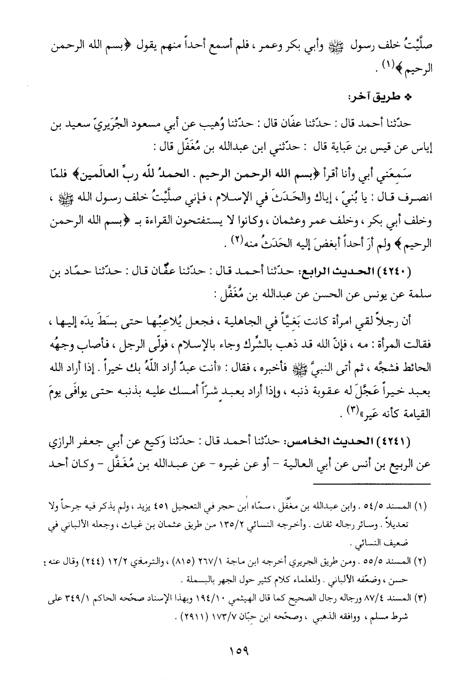 (٢) المسند ٥/ ٥٥. ومن طريق الجريري أخرجه ابن ماجة ١/ ٢٦٧ (٨١٥)، والترمذي ٢/ ١٢ (٢٤٤) وقال عنه: حسن، وضعّفه الألباني. وللعلماء كلام كثير حول الجهر بالبسملة.