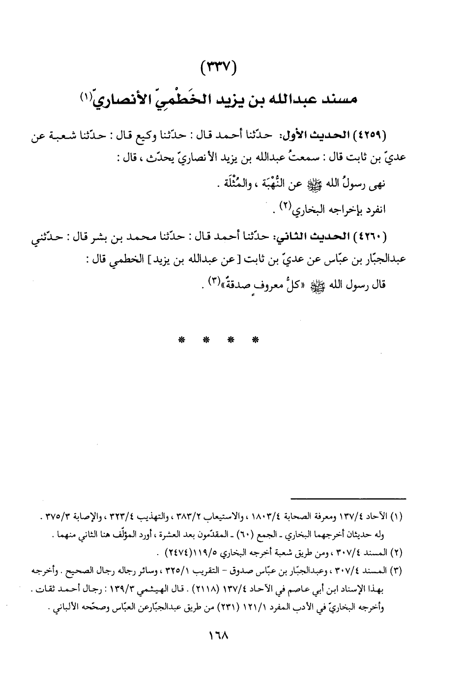 (٤٢٦٠) الحديث الثاني: حدّثنا أحمد قال: حدّثنا محمد بن بشر قال: حدّثني عبد الجبّار بن عبّاس عن عديّ بن ثابت [عن عبد اللَّه بن يزيد] الخطمي قال: