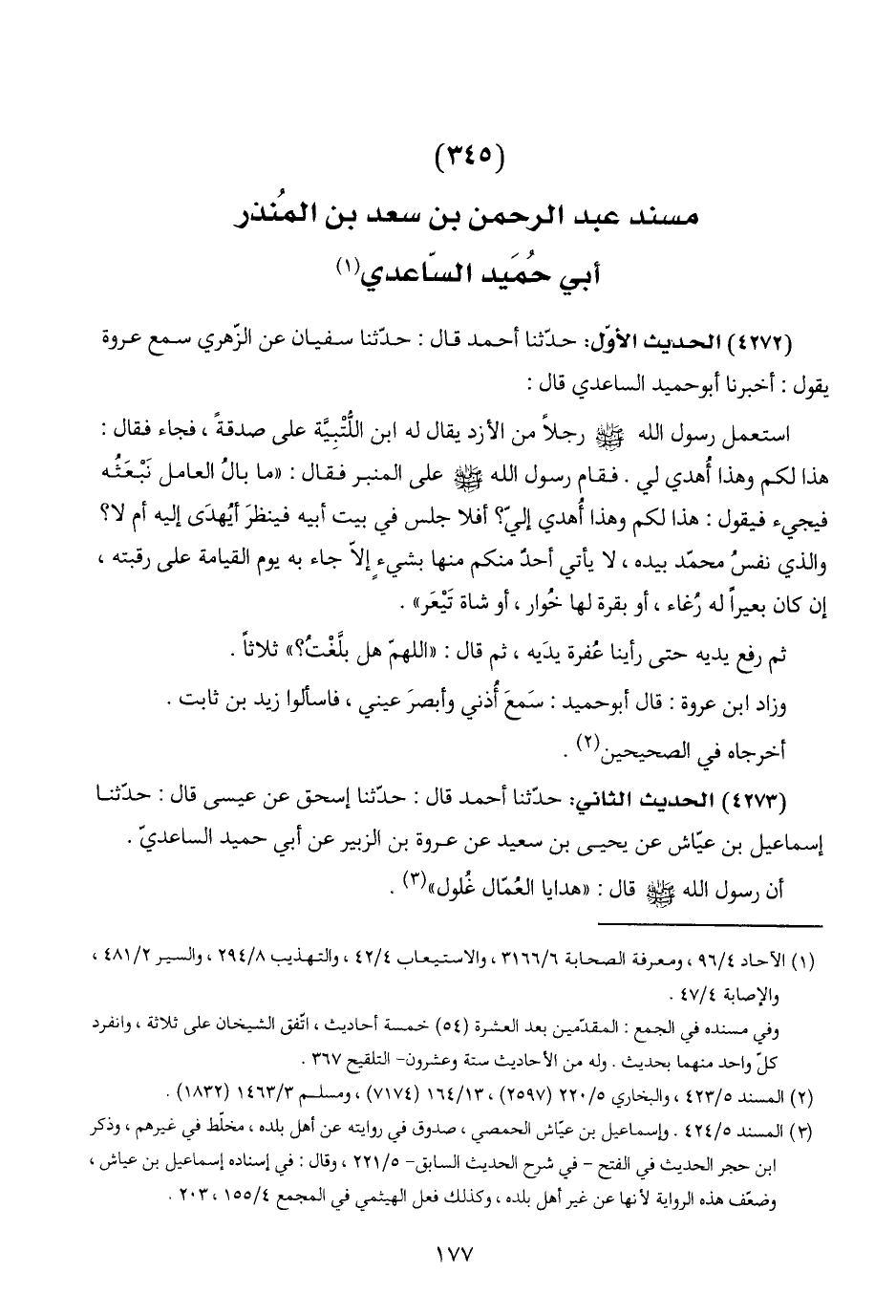 (٤٢٧٢) الحديث الأوّل: حدّثنا أحمد قال: حدّثنا سفيان عن الزّهري سمع عروة يقول: أخبرنا أبو حميد الساعدي قال: