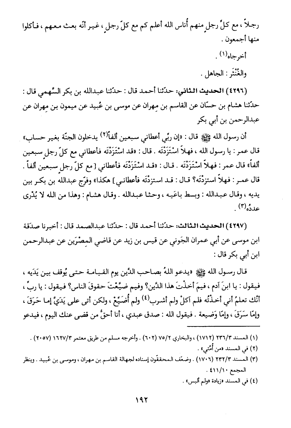 (٤٢٩٦) الحديث الثاني: حدّثنا أحمد قال: حدّثنا عبد اللَّه بن بكر السَّهمي قال: حدّثنا هشام بن حسّان عن القاسم بن مِهران عن موسى بن عُبيد عن ميمون بن مِهران عن عبد الرحمن بن أبي بكر: