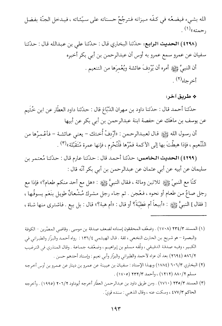 (٤٢٩٩) الحديث الخامس: حدّثنا أحمد قال. حدّثنا عارم قال: حدّثنا مُعتمر بن سليمان عن أبيه عن أبي عثمان عن عبد الرحمن بن أبي بكر أنّه قال:
