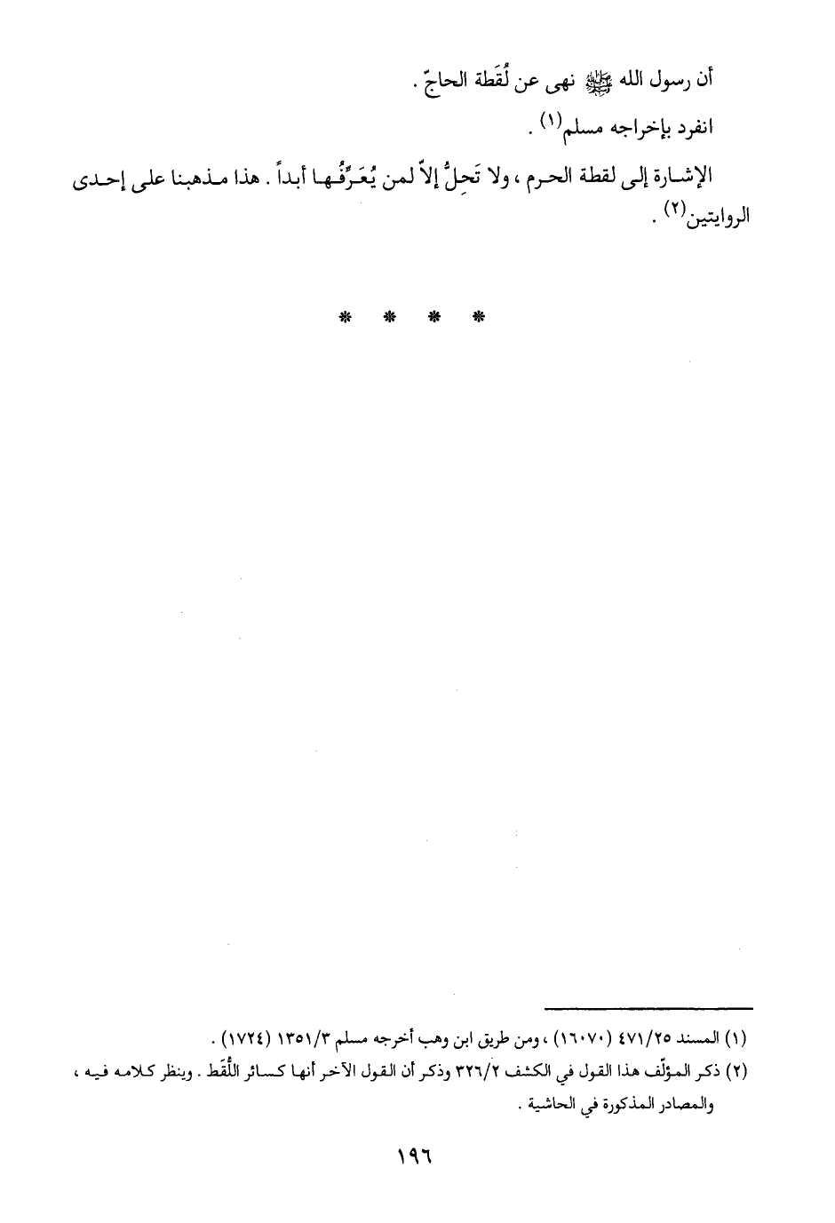 الإشارة إلى لقطة الحرم، ولا تَحِلُّ إلَّا لمن يُعَرِّفُها أبدًا. هذا مذهبنا على إحدى الروايتين (٢).