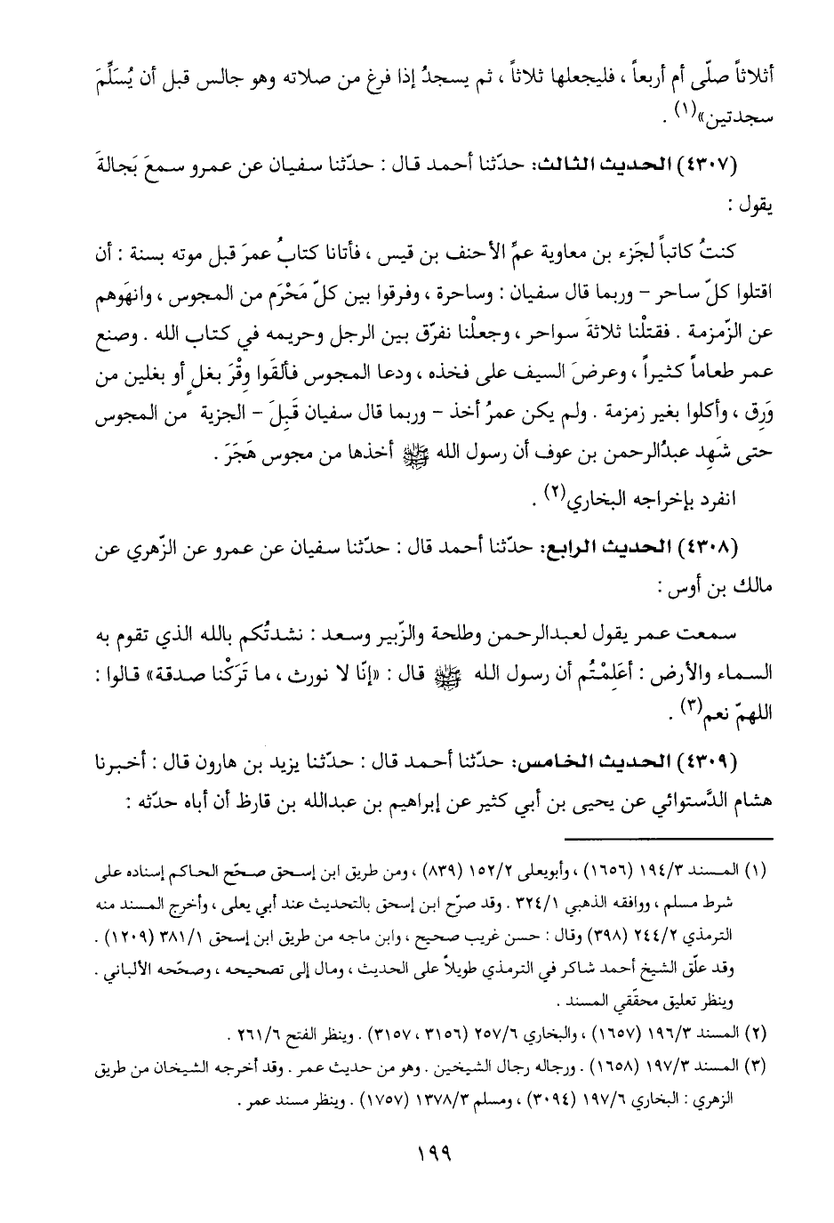 (٤٣٠٧) الحديث الثالث: حدّثنا أحمد قال: حدّثنا سفيان عن عمرو سمعَ بَجالةَ يقول: