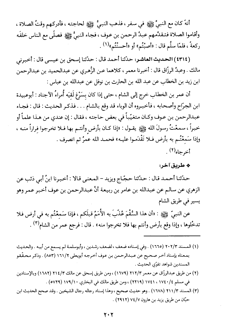 حدّثنا أحمد قال: حدّثنا حجّاج ويزيد - المعنى قالا: أخبرنا ابنُ أبي ذئب عن الزهري عن سالم عن عبد اللَّه بن عامر بن ربيعة أنَّ عبد الرحمن بن عوف أخبر عمر وهو يسير في طريق الشام:
