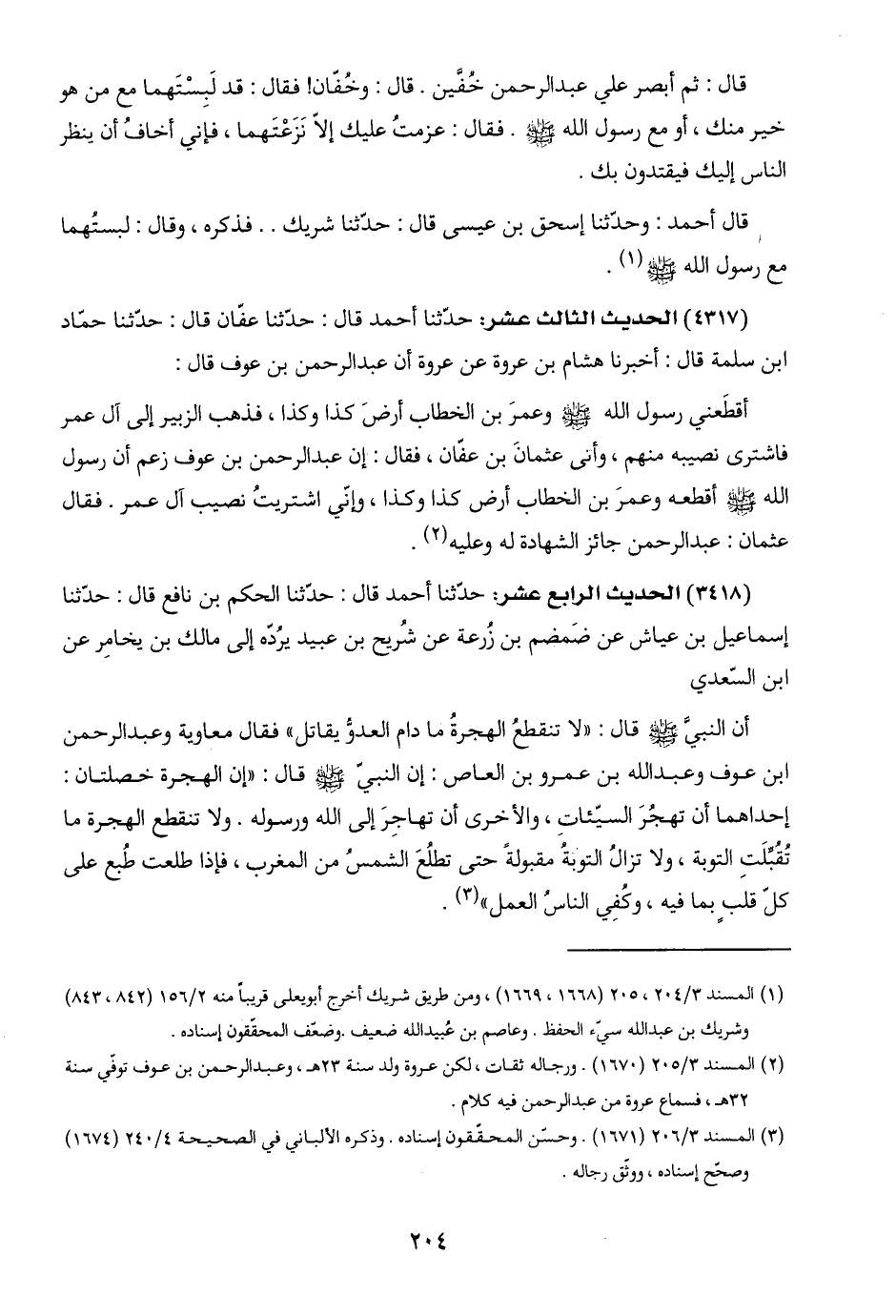 (٤٣١٧) الحديث الثالث عشر: حدّثنا أحمد قال: حدّثنا عفّان قال: حدّثنا حمّاد ابن سلمة قال: أخبرنا هشام بن عروة عن عروة أن عبد الرحمن بن عوف قال: